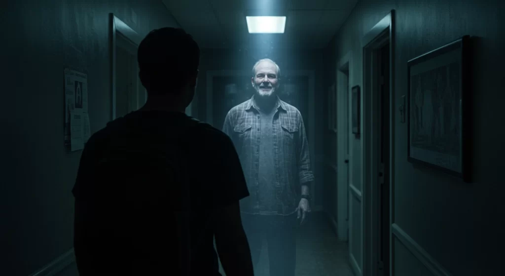 De pé, no final do corredor, estava o meu pai. Ele estava lá, de pé, vestindo a sua camisa polo favorita, com as mãos no bolso e me olhando. Não era uma sombra, nem uma figura distorcida. Era ele, com sua barba por fazer e o seu olhar de sempre. Meu coração parou. O ar pareceu ficar mais pesado. Fiquei paralisada, a camisa dele nas minhas mãos. Ele não disse uma palavra. Apenas me olhou com um leve sorriso.
