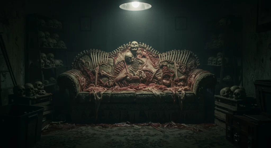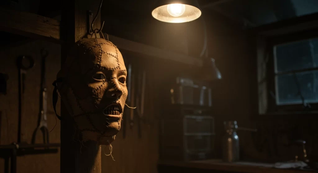 - Máscaras de Pele Humana: O traço mais marcante de Leatherface, a máscara de pele humana, foi tirado diretamente dos crimes de Gein. Ele confessou ter desenterrado corpos de cemitérios locais para criar máscaras e outros objetos, motivado por um desejo doentio de “se vestir como sua mãe”.
