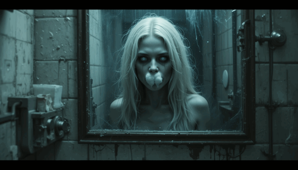 Como resultado dessas ações, o espírito de uma jovem loira, com algodão no nariz e na boca para conter o sangramento, supostamente apareceria no reflexo, pronta para assombrar quem ousou perturbá-la.