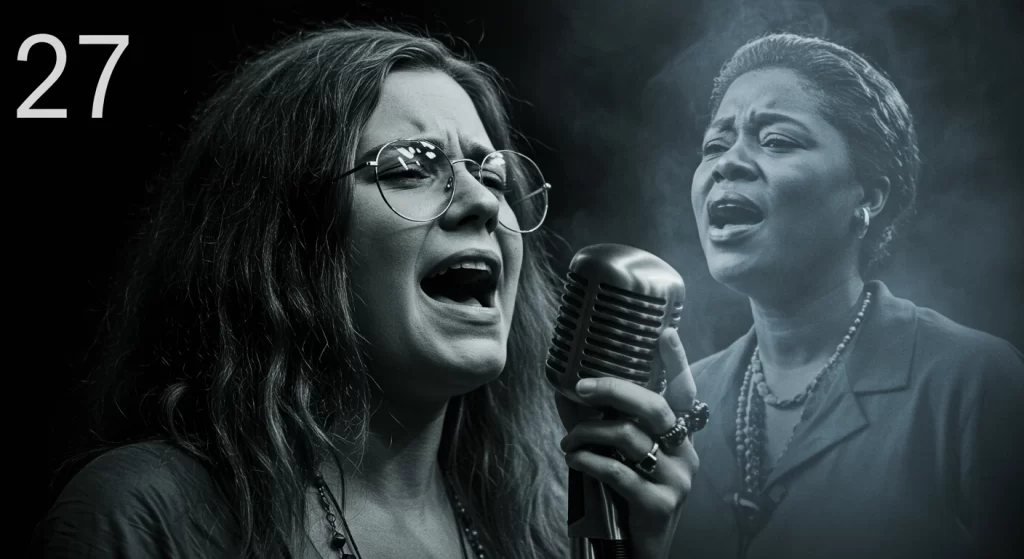 1. Janis Joplin (1943-1970): Uma das maiores vozes do blues e do rock, Janis Joplin morreu de overdose de heroína em outubro de 1970. Sua voz poderosa e presença de palco magnética foram perdidas precocemente, assim como a de Hendrix e Morrison.